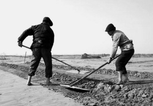 除一幅“盐板晒盐”(左图)是上世纪60年代时晒盐的真实景象,其余几幅都是2008年为了“申遗”而摆拍的照片,也算是及时的抢救吧。复制的工具、复制的环境、复制的劳动姿态,但是,钱塘江晒盐已成为不可复制的过去。